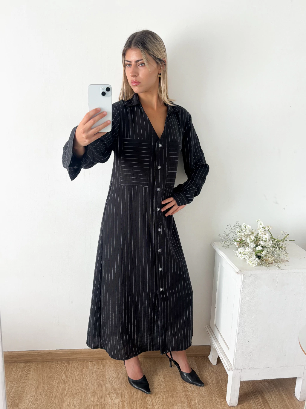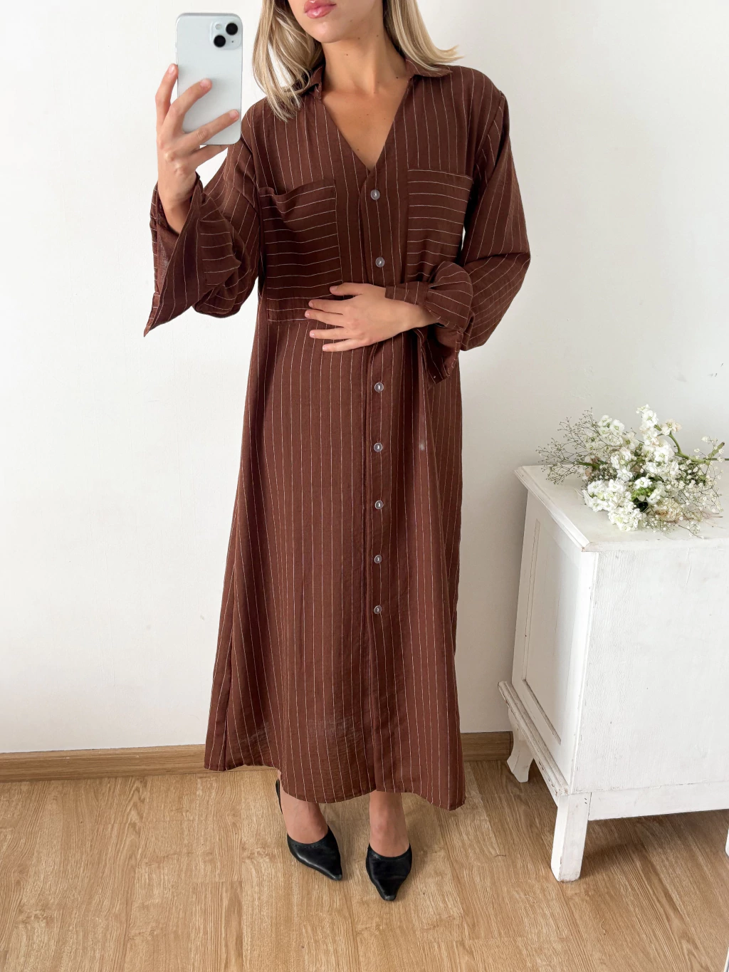 Maxi vestido lino rayado camisero con bolsillos plaque en pecho