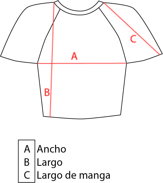 TALLE S: (A)ANCHO DE SISA A SISA: 32CM / (B)LARGO: 42CM / (C) LARGO DE MANGAS: 14CM