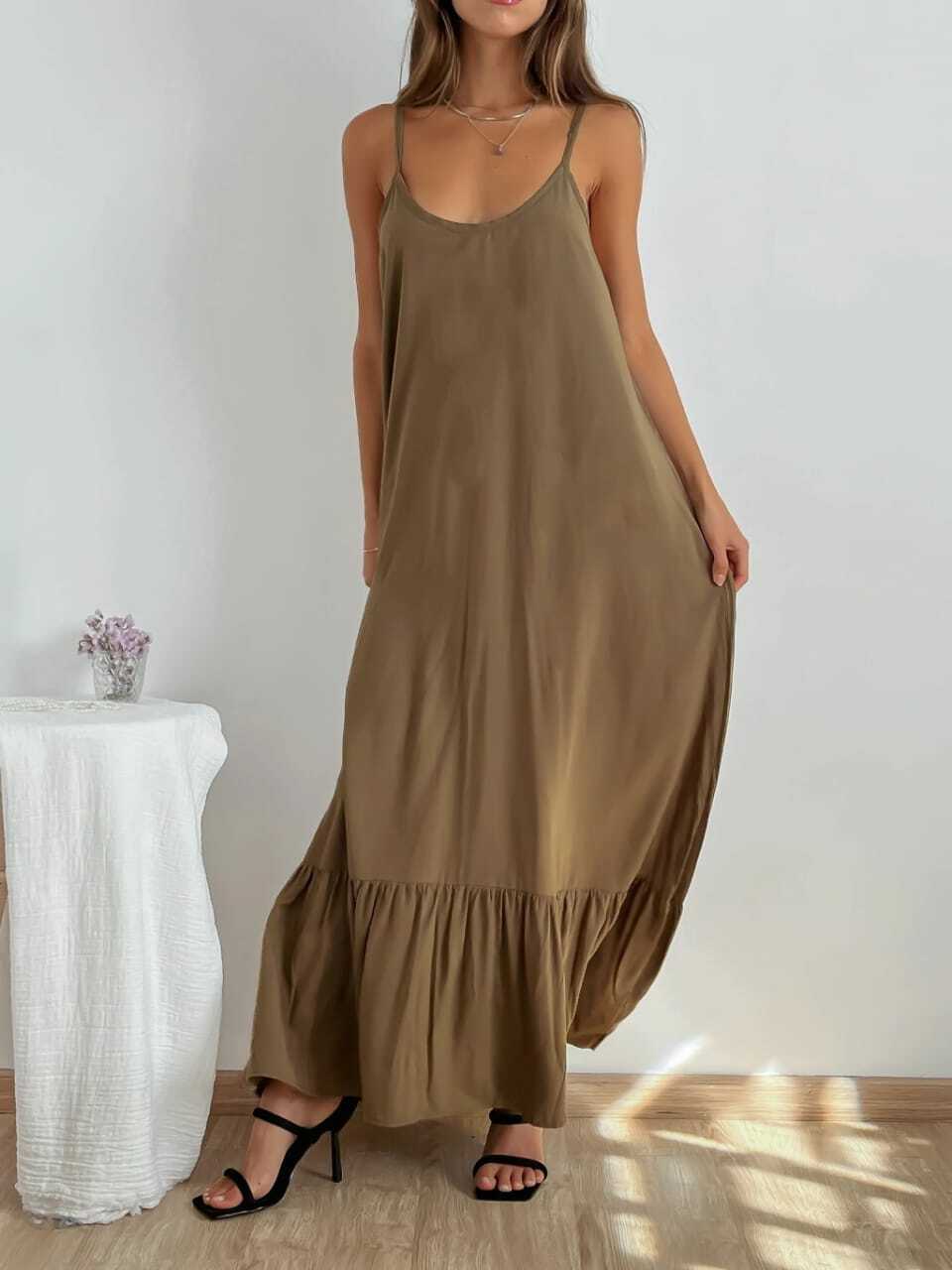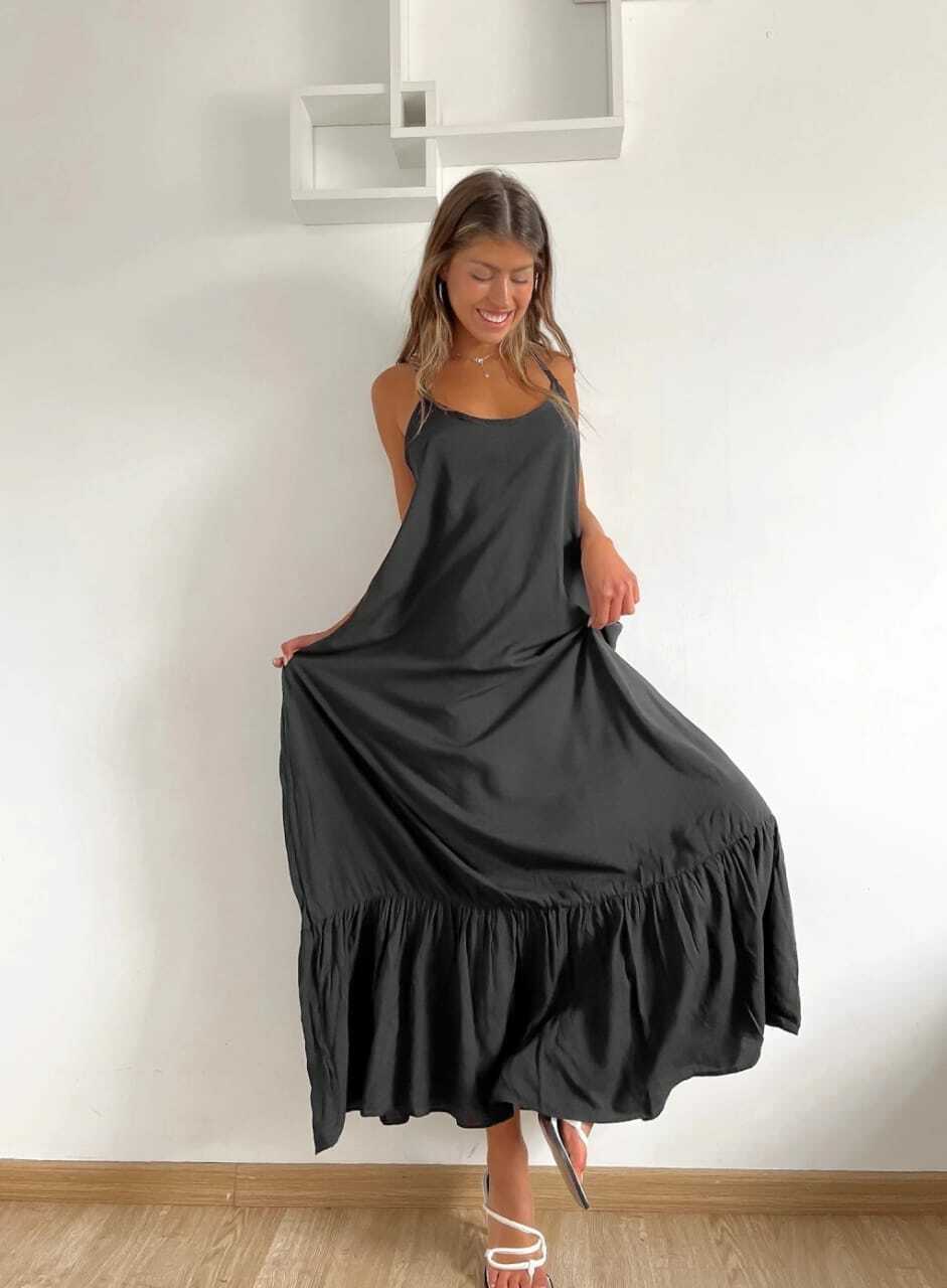 Vestido largo y amplio, con breteles finos y terminación de volado con frunce en recorte inferior