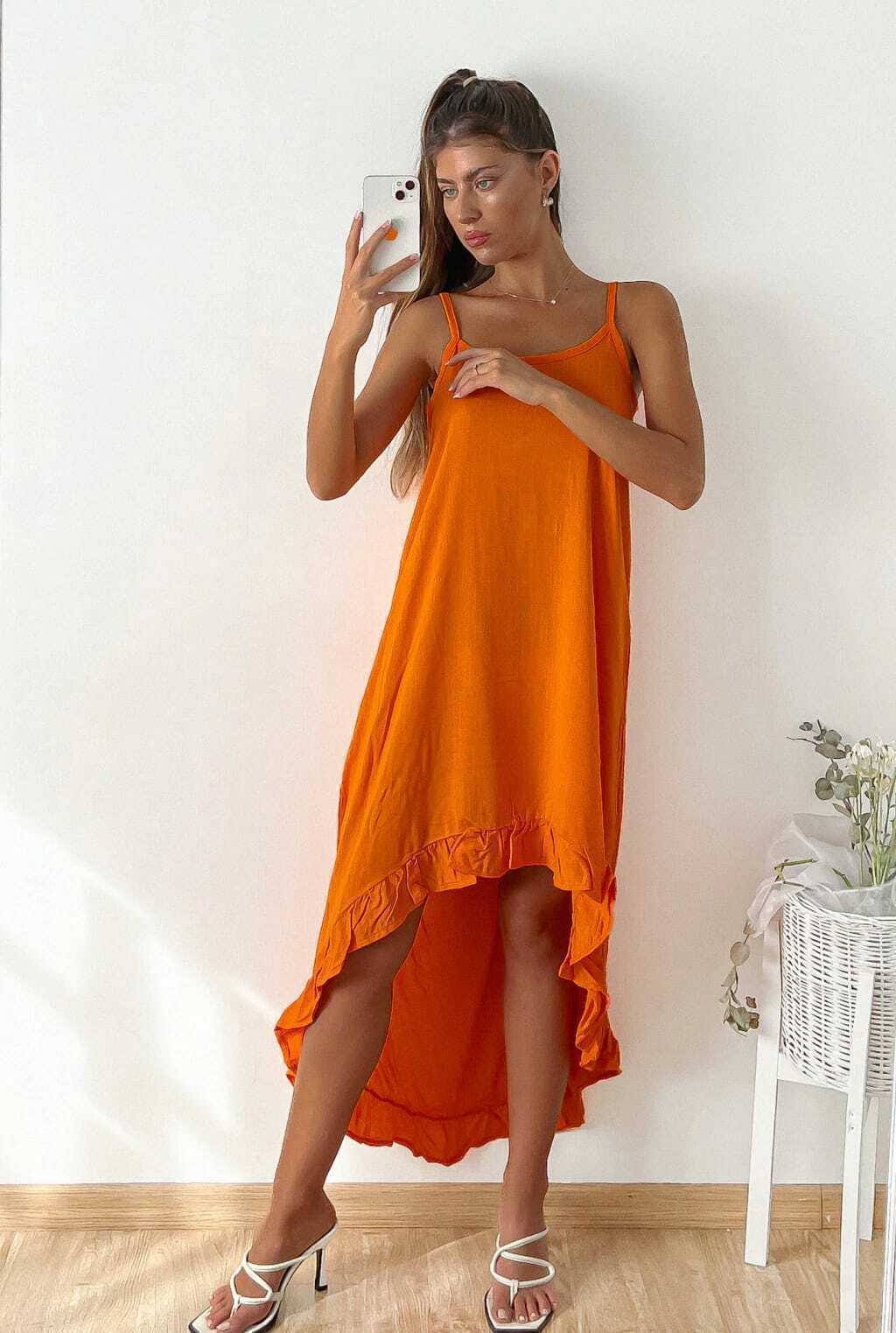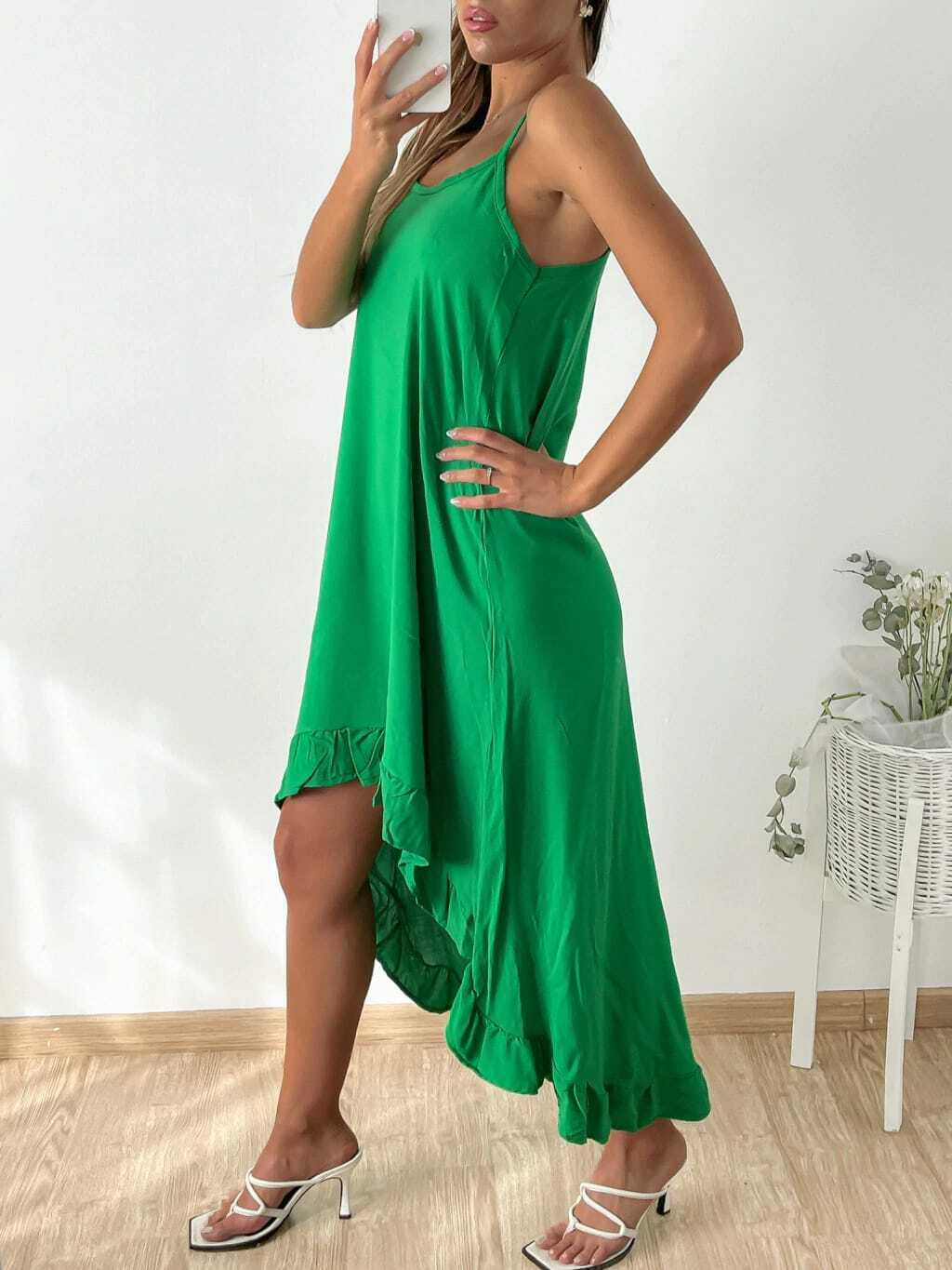 Vestido de lino spandex con breteles finitos y terminacion irregular con volados